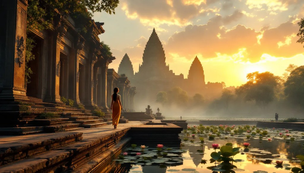 Cambodia is a land where temples bloom from jungle roots, and every stone holds a sacred story. At sunrise, Angkor Wat glows like fire, its towers mirrored in still waters, watched over by carved apsaras frozen in an eternal dance. The ancient Khmer Empire may have faded, but its spirit still lingers — in architecture, in rhythm, in resilience. In the capital, Phnom Penh, saffron robes flow beside the Mekong, where monks move through morning markets humming with incense and motorbikes. Across the countryside, rice paddies shimmer, oxen tread ancient paths, and children race through palm-dotted fields. Cambodia’s legacy of pain has not silenced its soul — it has sharpened its beauty into something enduring. Apsara dancers sway like memory itself, while artisans weave silk, carve wood, and mold silver in ways passed down for centuries.